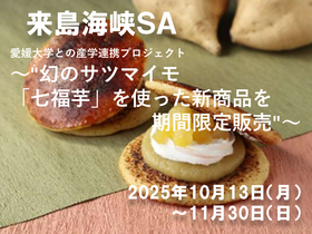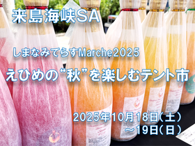「えひめの人気モノ」 【2024年9月13日(金)から2024年10月2日(水)まで】(ご好評のうちに、終了しました) E76西瀬戸自動車道 来島海峡サービスエリアにて、えひめの人気商品を集めたイベント「えひめの人気モノ」を開催します。 来島海峡サービスエリアでご好評いただい... 「しまなみてらすMarket〜ココロまじわうトコロ 宇和島フェア〜」 【2024年8月23日(金)~2024年9月11日(水)まで】(ご好評のうちに、終了しました) E76西瀬戸自動車道 来島海峡サービスエリアにて、宇和島市とのコラボレーションによる「しまなみてらすMarket〜ココロまじわうトコロ 宇和島フェア〜」を開催... 来島海峡SA「うちの魚が一番うまいと思うとる」宮窪フェア【2024年7月28日(日)から2024年8月21日(水)まで】(ご好評のうちに、終了しました) E76西瀬戸自動車道 来島海峡サービスエリアでは、「うちの魚が一番うまいと思うとる」宮窪フェア開催します。 しまなみ海道の来島海峡SAの目の前の島「大島」。... 一覧を見る