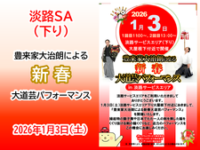 E28神戸淡路鳴門自動車道 淡路SA(下り)では、2026年1月3日(土)に『豊来家大治朗による 新春 大道芸パフォーマンス』を開催いたします。 傘回しや...