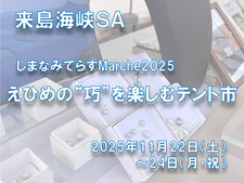 E76瀬戸内しまなみ海道(西瀬戸自動車道) 来島海峡SAでは、「しまなみてらすMarche2025~えひめの"巧"を楽しむテント市~」を開催します。 愛媛...