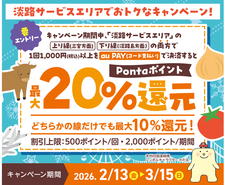 淡路SA(上り・下り)では、2月13日(金)より「au PAY」を利用すると Pontaポイントが最大20%還元されるキャンペーンを実施します。 さらに、...