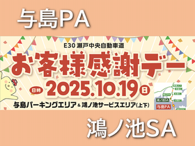 E30瀬戸中央自動車道 「お客様感謝デー2025」を開催します E30瀬戸中央自動車道をご利用されるお客様へ日頃の感謝の気持ちを込め、「お客様 「しまなみ海道 グルメラリー」 ~橋がつなぐ、ふたつの秋景色~ E76西瀬戸自動車道の大浜PA(上下)と来島海峡SAでは、秋の行楽シーズンにお 「しまなみてらすMarche2025~えひめの"ええもん"テント市~」を開催 【 E76西瀬戸自動車道 来島海峡サービスエリアでは、「しまなみてらすMarche 今治市の中学生が来島海峡SAで職場体験学習 しまなみ海道の四国の玄関口である来島海峡SAでは、7月1日(火)から7月3日( 来島海峡サービスエリアにて、林野火災をテーマにしたパネル展を開催しています(ご好 今治市は、2025年3月23日に市内で発生した林野火災について、防災意識の定着 SA・PAのフードコート・売店等の営業時間のご案内について 一覧を見る